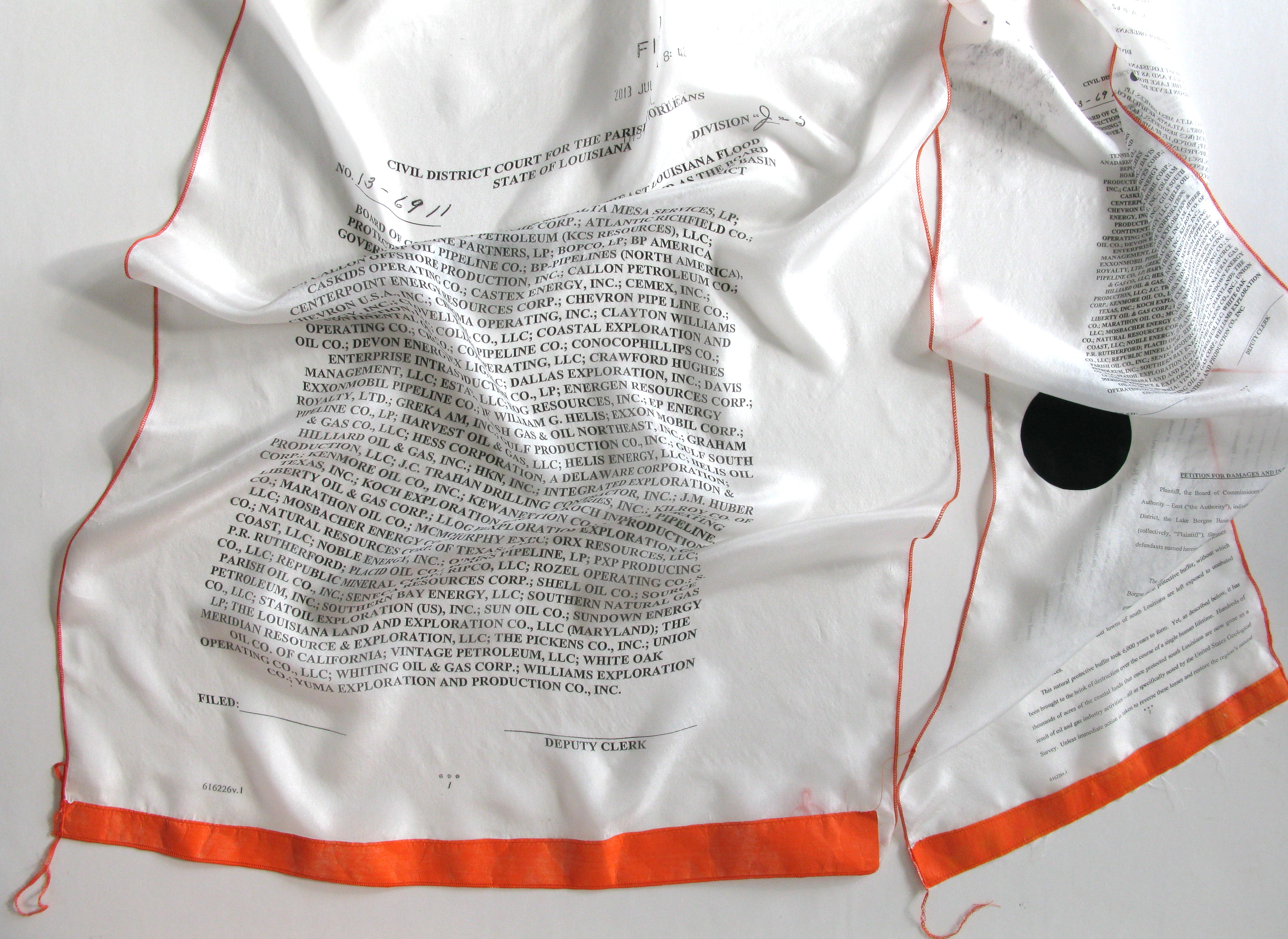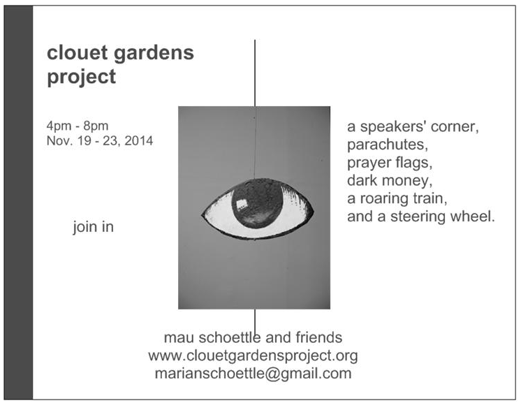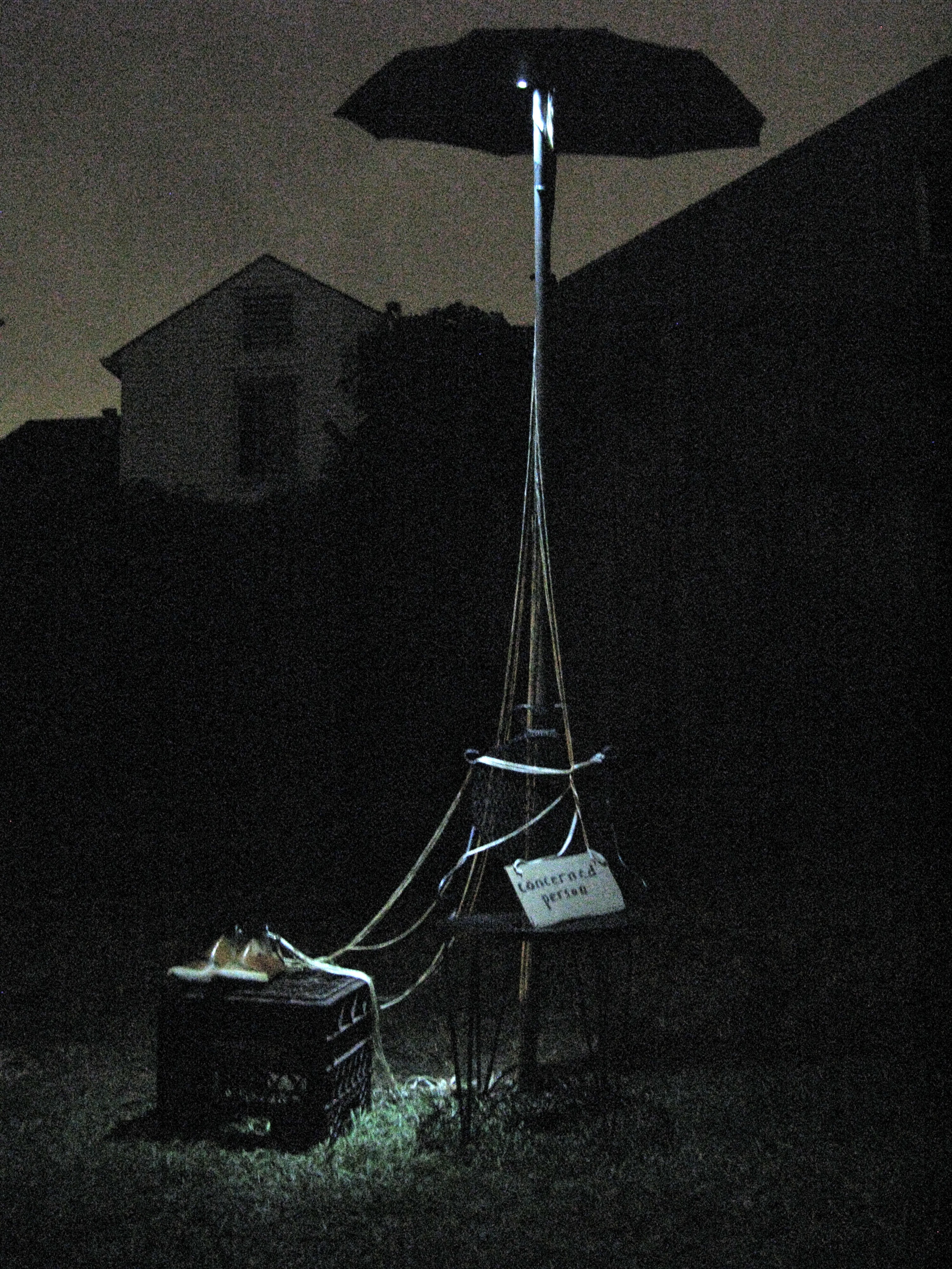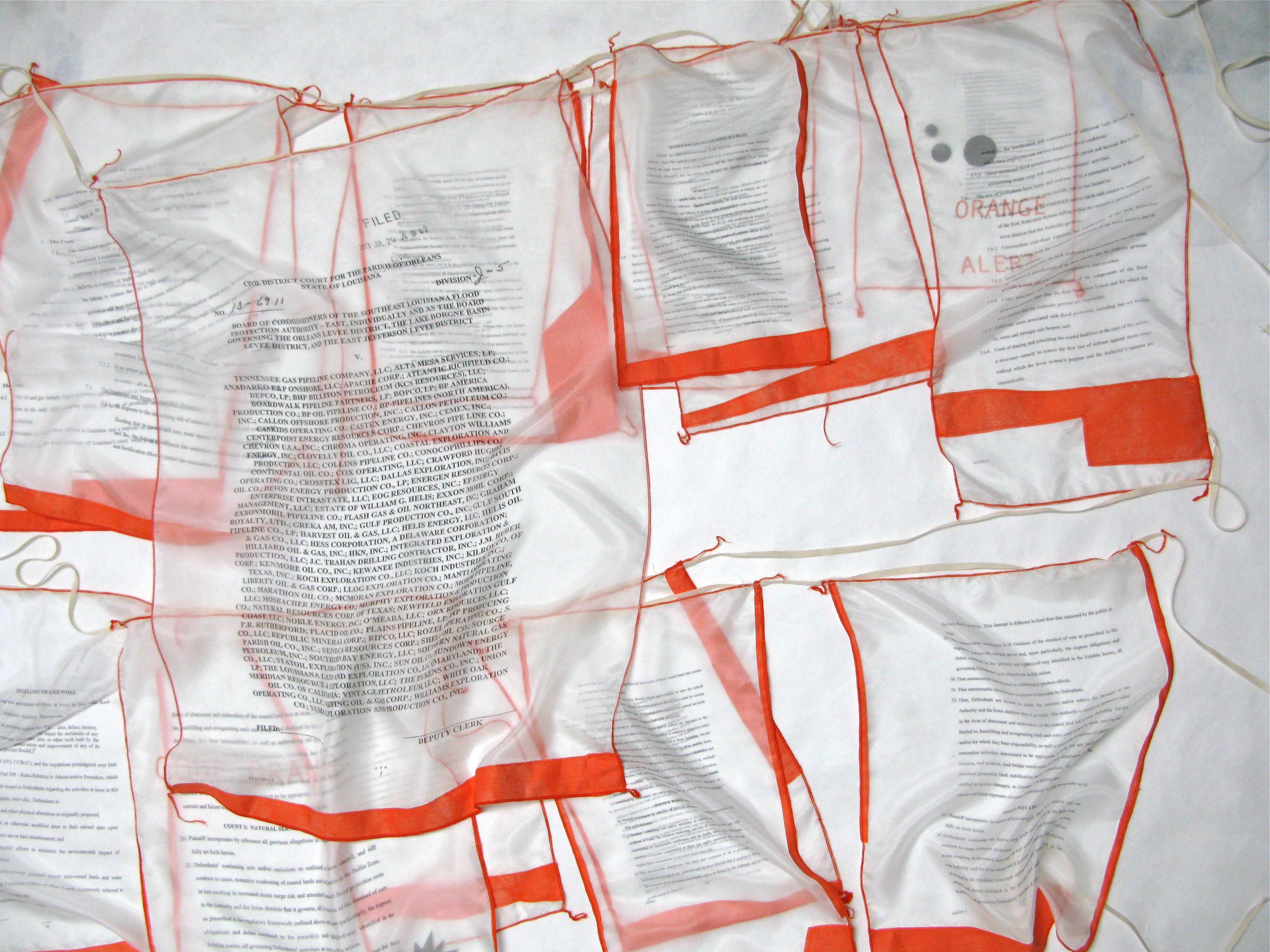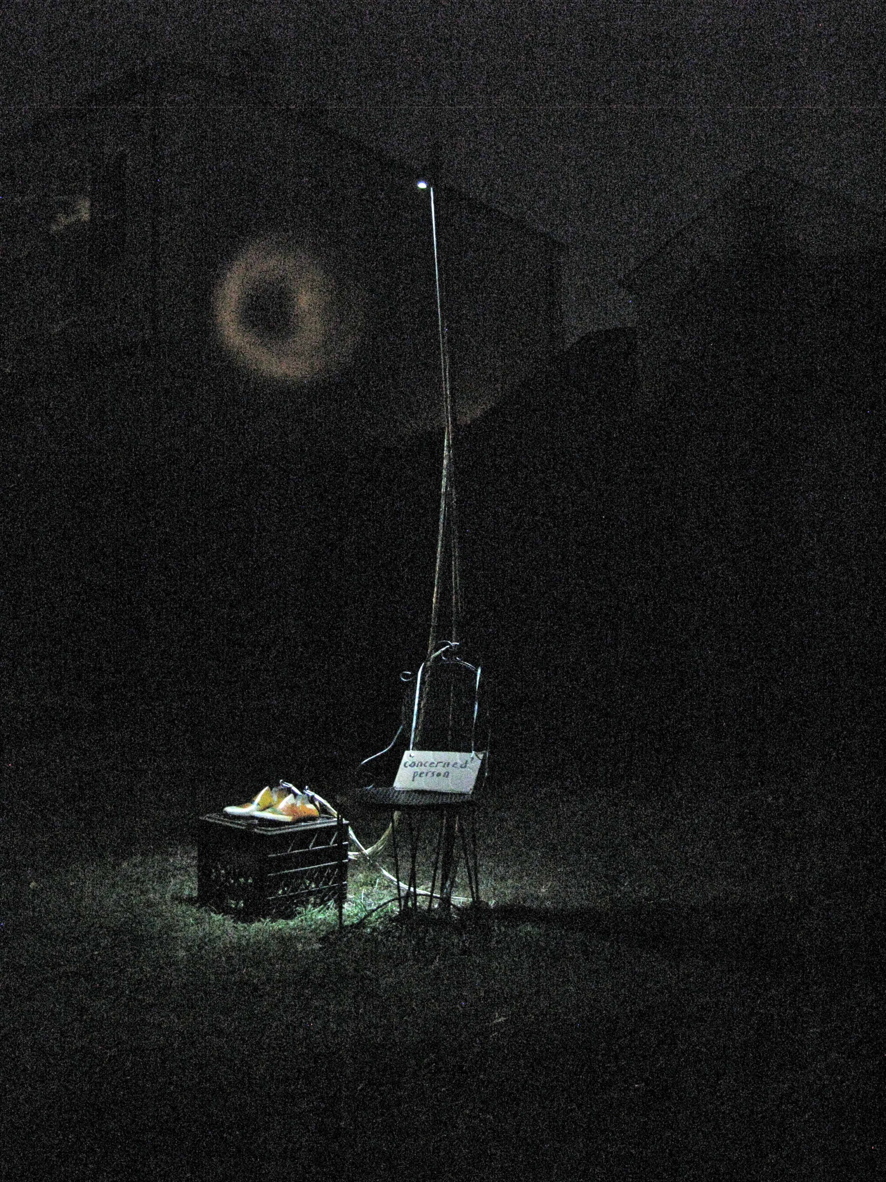 A public project in the temporary Clouet Gardens Park: an occupation of an unorganized territory in a conflict zone of disputed entitlement. Bureaucratic file cases and deflated parachutes are caught up in the old oak tree while a surveillance beacon sweeps the perimeter of the park. There is dark money, a control steering wheel, a couple of nomadic tents, megaphones, a swing and a dangling telephone. The full text of the lawsuit against Oil and Gas Companies is hung out on a laundry line. A chance to witness and participate. The Fringe Festival, New Orleans.