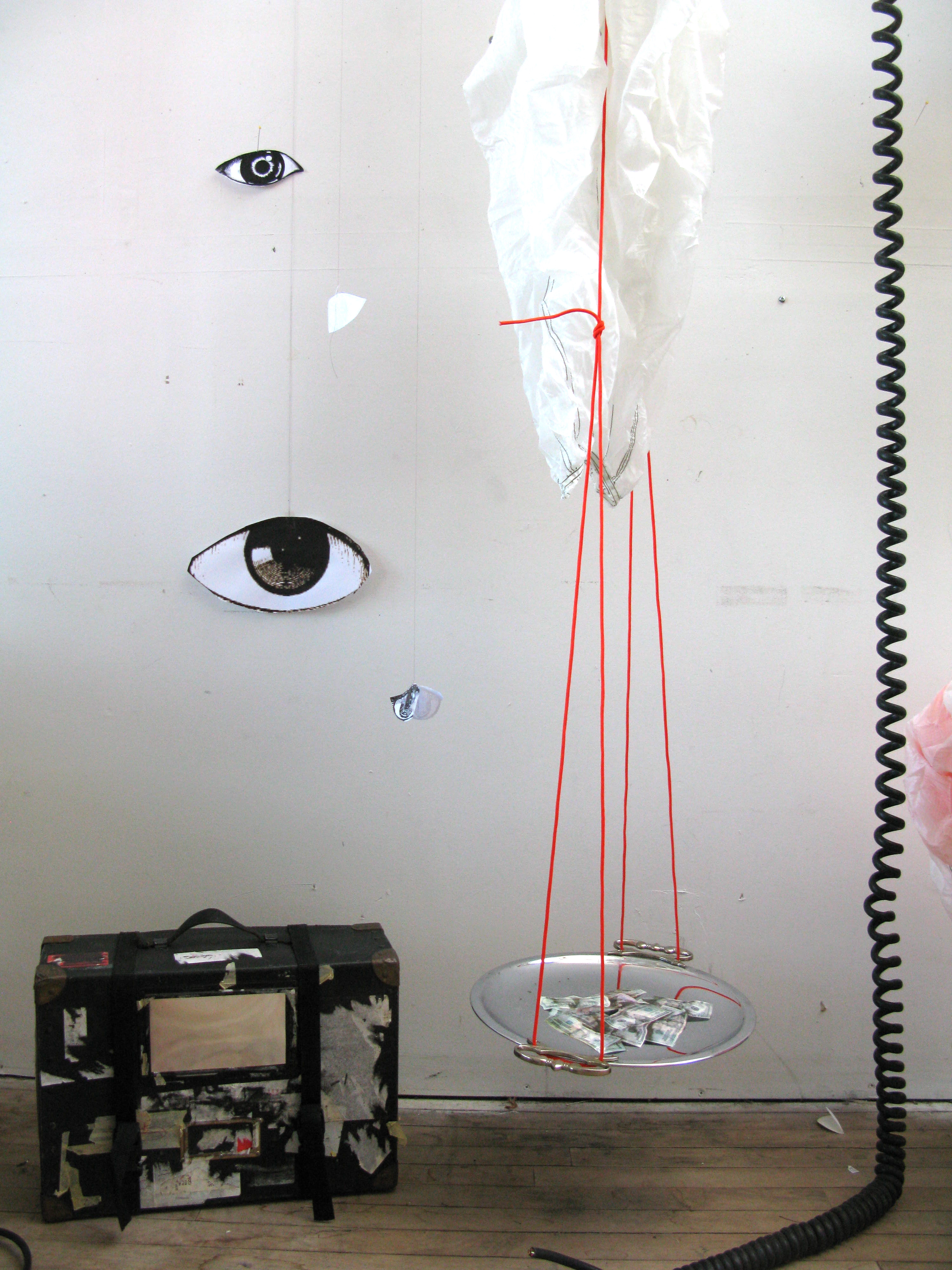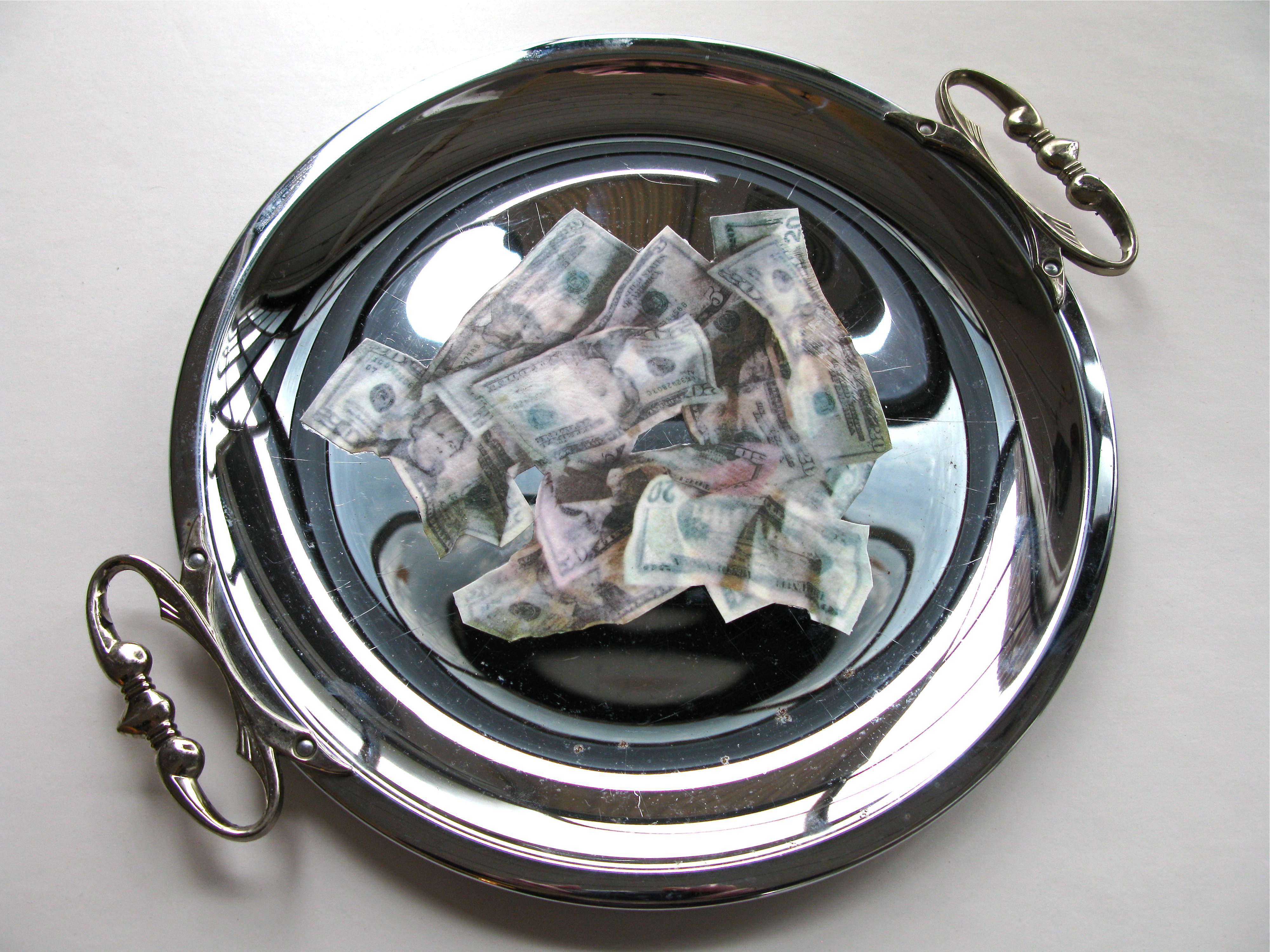 in my studio – silver platter, serving spoon, dark money, telephone from the sky, and mock-up